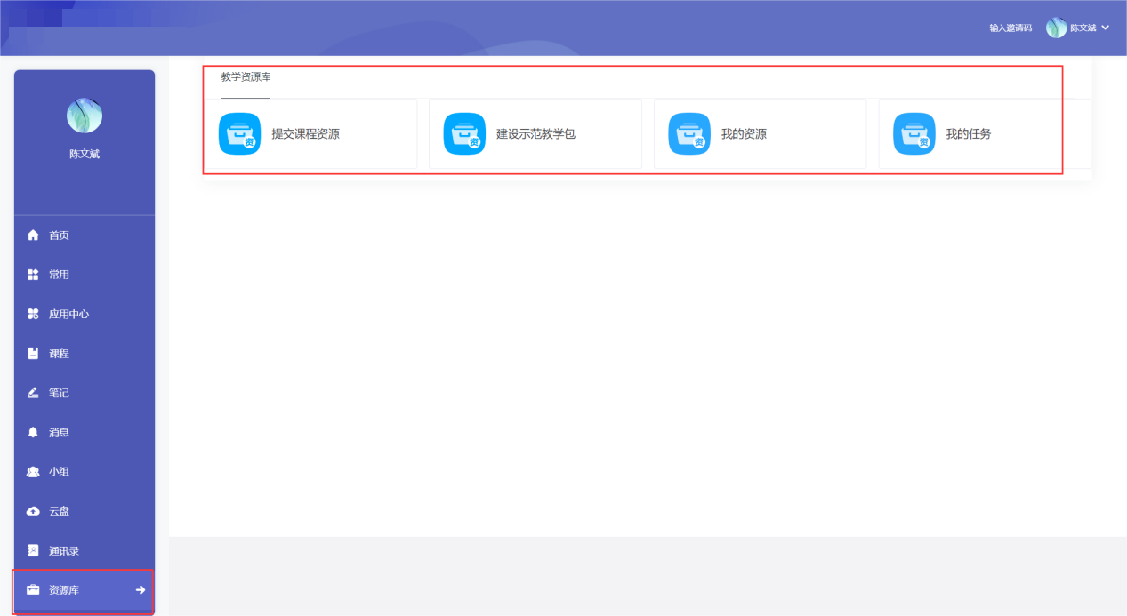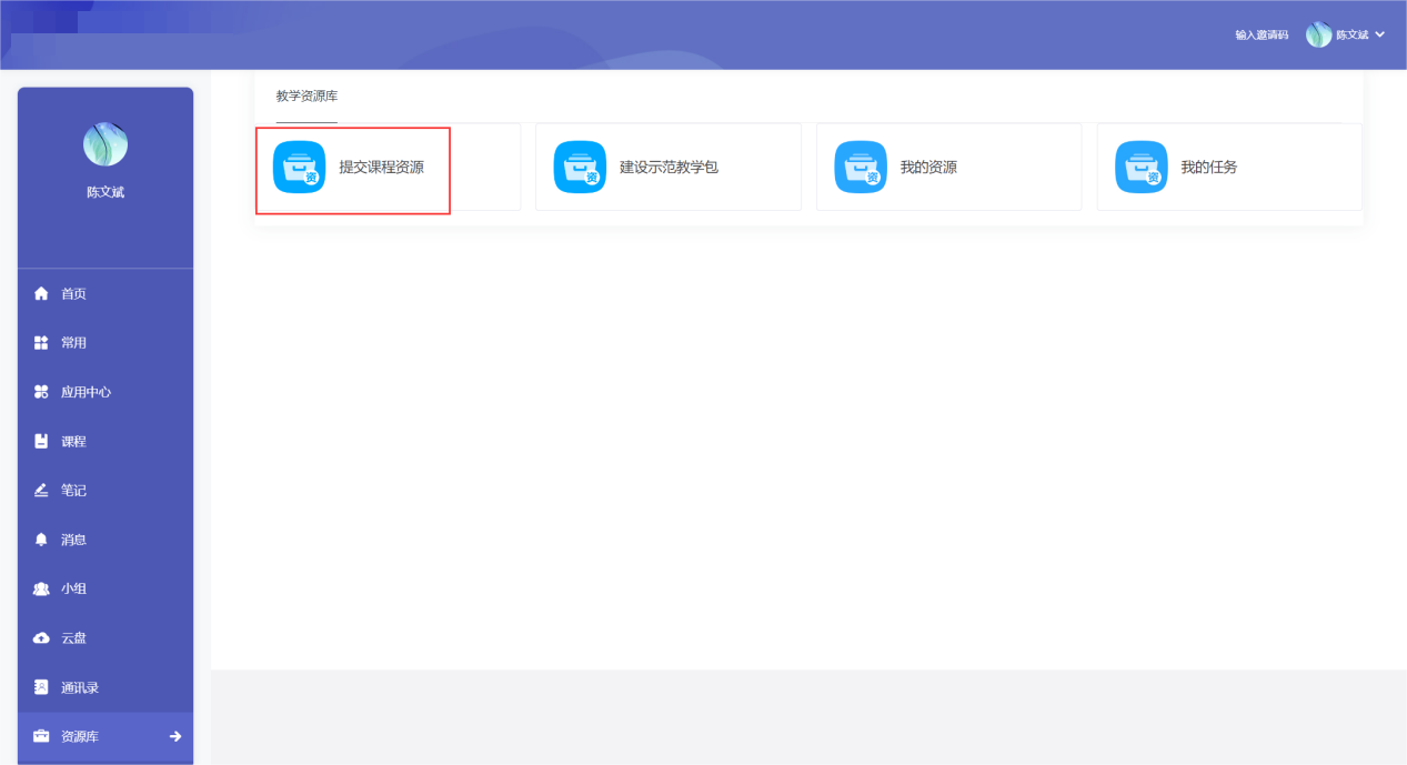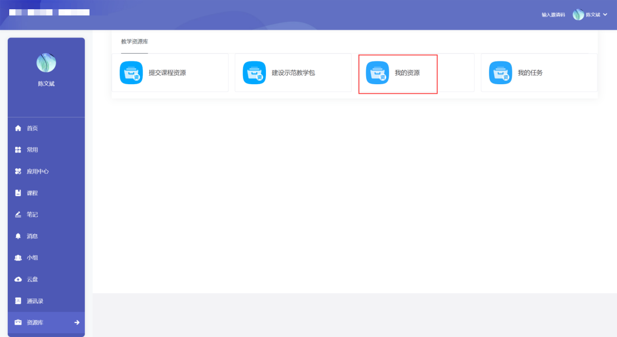 登录后点击右上角【进入空间】即可进入个人空间页面,找到左侧导航栏【资源库应用】-【我的资源】进行颗粒化资源上传;