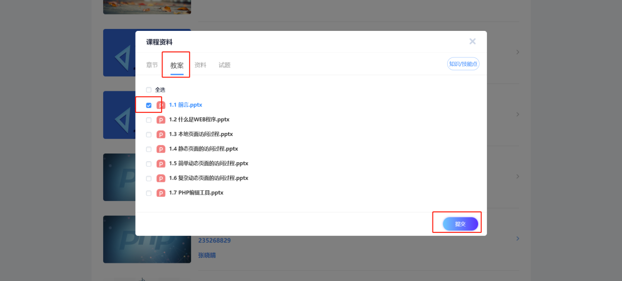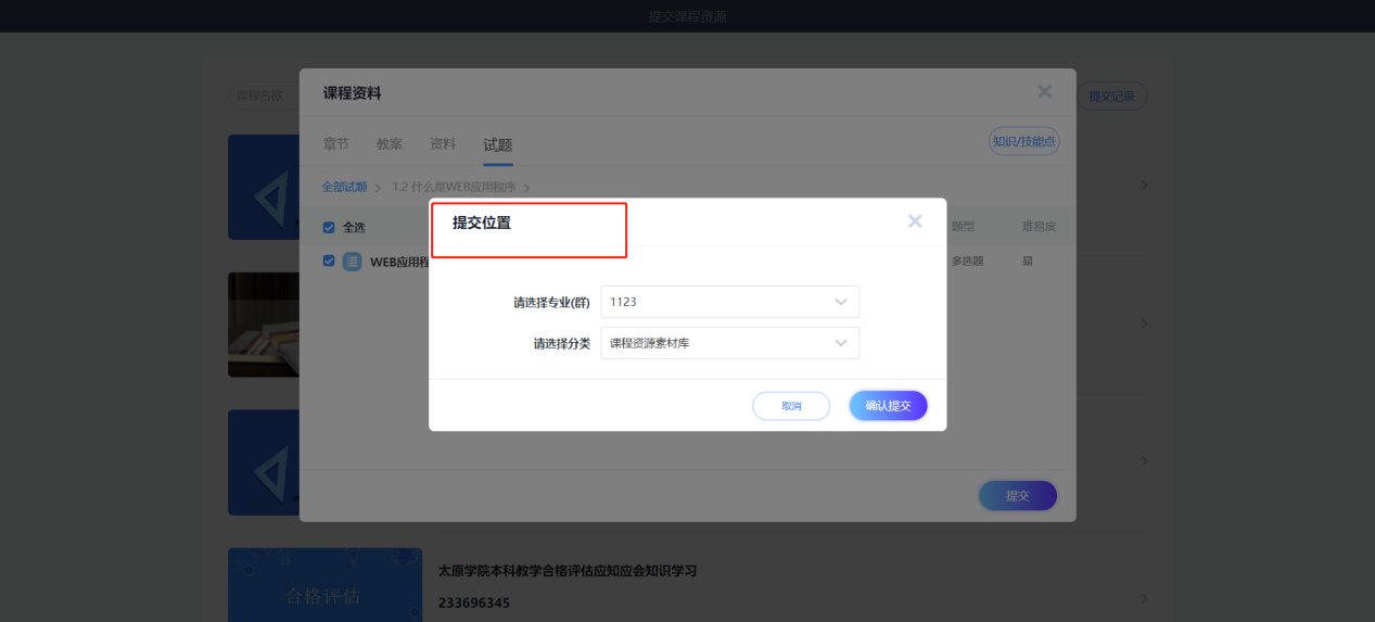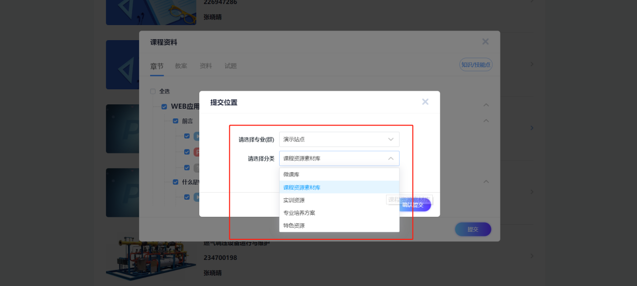 点击课程,选择课程资源中的章节,勾选需要提交的章节素材,并选择提交的专业及素材分类位置进行确认提交;