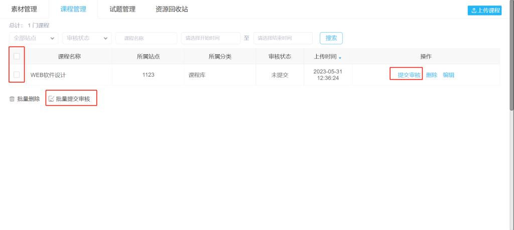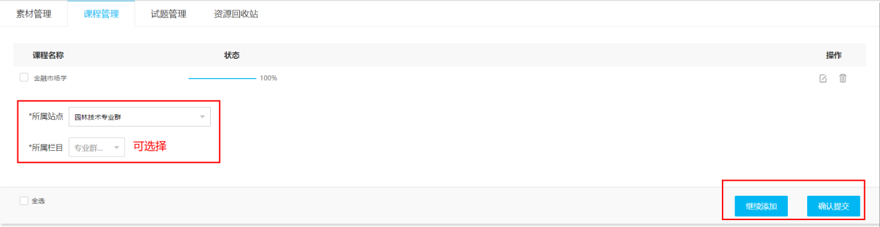 选择所属站点-->所属栏目,勾选课程并点击“确认提交”即可;