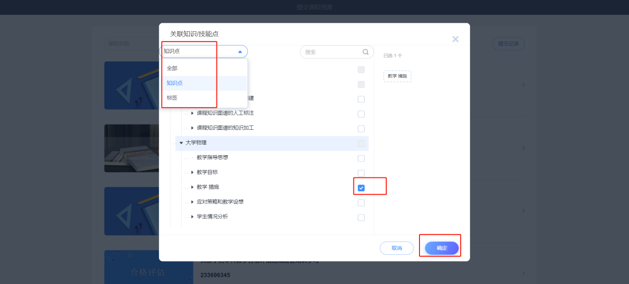 点击【课程资料】-【试题】勾选需要上传的试题资源,点击右上角【知识/技能点】,勾选试题所需关联的知识点/标签,将试题和对应的知识点进行关联后,上传至提交位置。