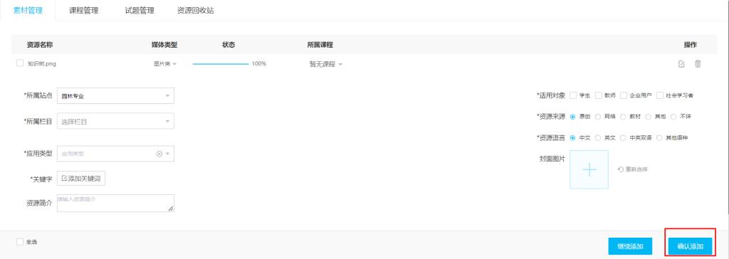 选择上传文件的所属站点及栏目、应用类型、素材对应的关键字、适用对象(素材给什么身份可见)、资源来源和资源语言等信息;